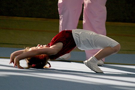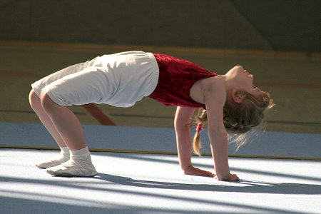 Den Kopfstand kann ich an der Wand schon alleine, hab ich zu hause geübt und mit den Fußspitzen immer das Licht angemacht. So muss die Trainerin immer die Füße noch bissl festhalten.