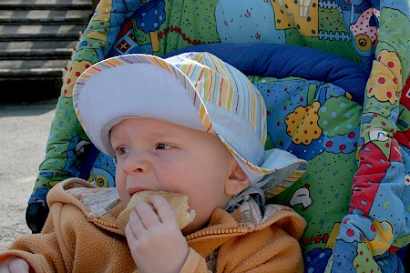 Mein Bruder kann ja noch nicht mit toben und auch noch keinen Knüppelkuchen backen. Aber er freut sich immer, wenn er eine Semmel bekommt.