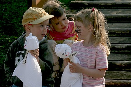 Als wir satt waren, konnten wir noch toben. Und dann gab's noch eine Überraschung. In den Bäumen hingen viele kleine gespenster und jedes Kind durfte sich eins nehmen. |