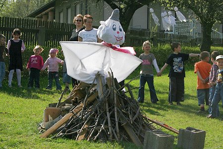 Endlich ist es soweit. Ich hab mich schon die ganze Woche auf das Gespensterfeuer gefreut. Wir hatten ja schon kräftig Holz gesammelt und oben drauf hockt das Wintergespenst.