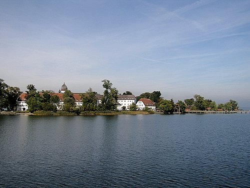 Von der Herreninsel aus geht es weiter zur Fraueninsel. Nach der Klostertradition entstand die Benediktinerinnenabtei Frauenchiemsee als Stiftung des bayerischen Herzogs Tassilo III. um 766. Diese Insel ist mit 0,105 qkm zwar wesentlich kleiner als die herreninsel, aber dichter besiedelt, hauptsächlich von Klosterangestellten und Fischern. »»